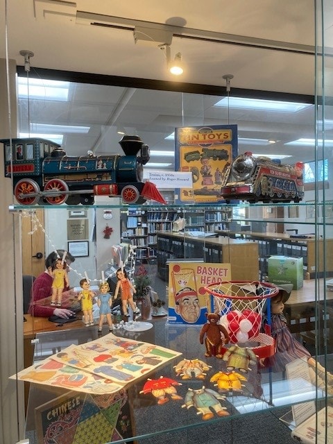 There is sure to be something to please every visitor: a German doll c. 1900 found in an Avon attic; a Topsy Turvey doll (double-ended with opposing figures) from the late 1920s; a doll with roller skates from the late 1930s; a bear and a doll from the 1940s; trains from the 1950s; Legos and Steiff animals from the 1960s; school valentines from 1965-1970; German block puzzles from the 1980s, and so much more.